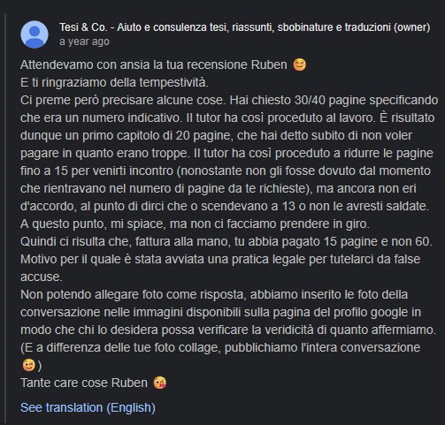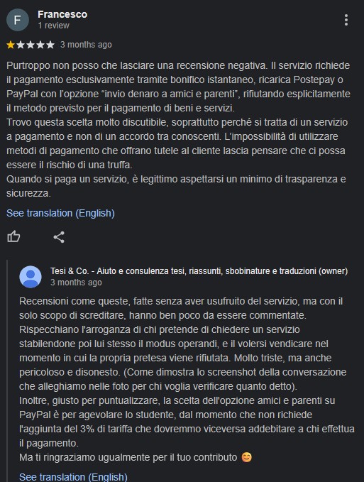 Come sempre in questi casi di recensioni su Google Business va notato come sia strano che degli studenti che si sono fatti aiutare a scrivere la tesi lo scrivano pubblicamente usando il loro nome e cognome reali, andando incontro a problemi con la propria università.